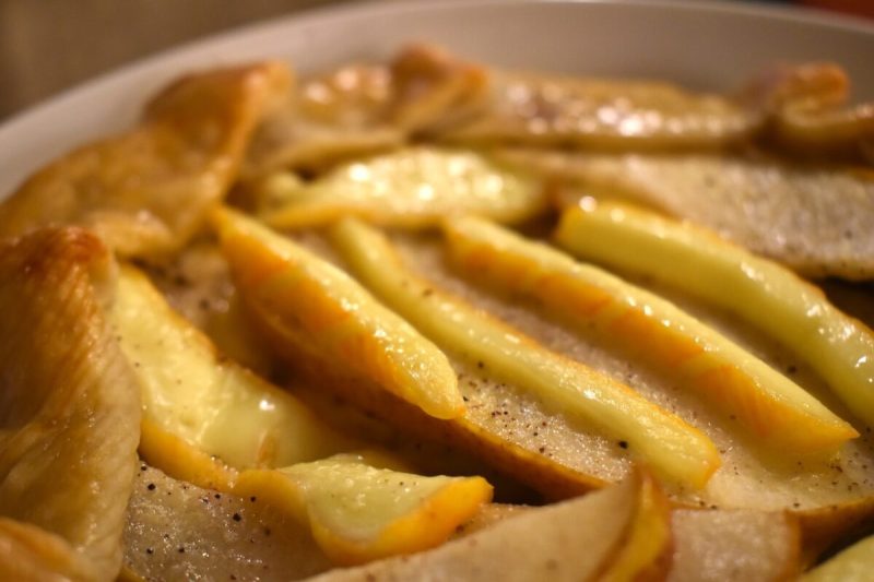 Arrange your pear slices in your pie crust, weaving in your brie slices and a thin slice of butter here and there.