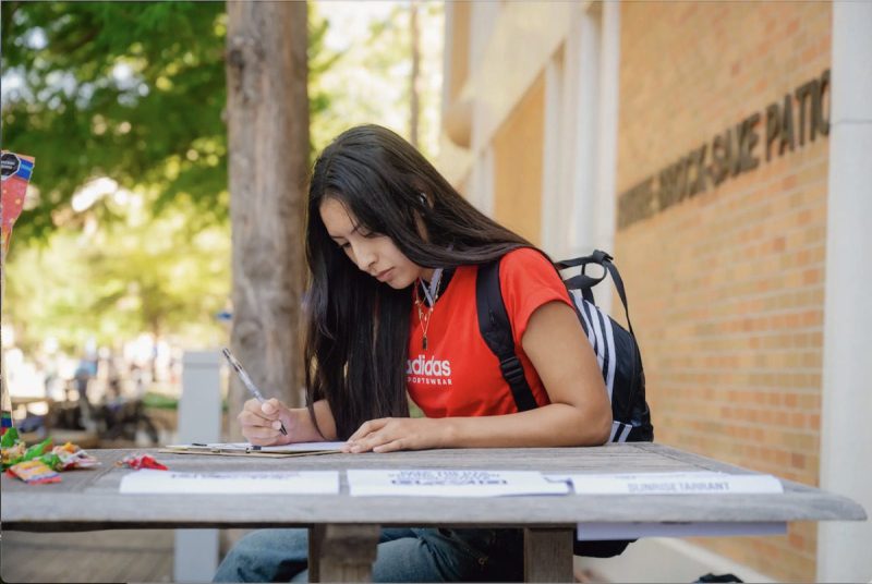 Makayla Ortega, 19, a student at University of Texas at Arlington, registers to vote at the UTA campus on Sept. 10, 2024. Credit: Desiree Rios for The Texas Tribune