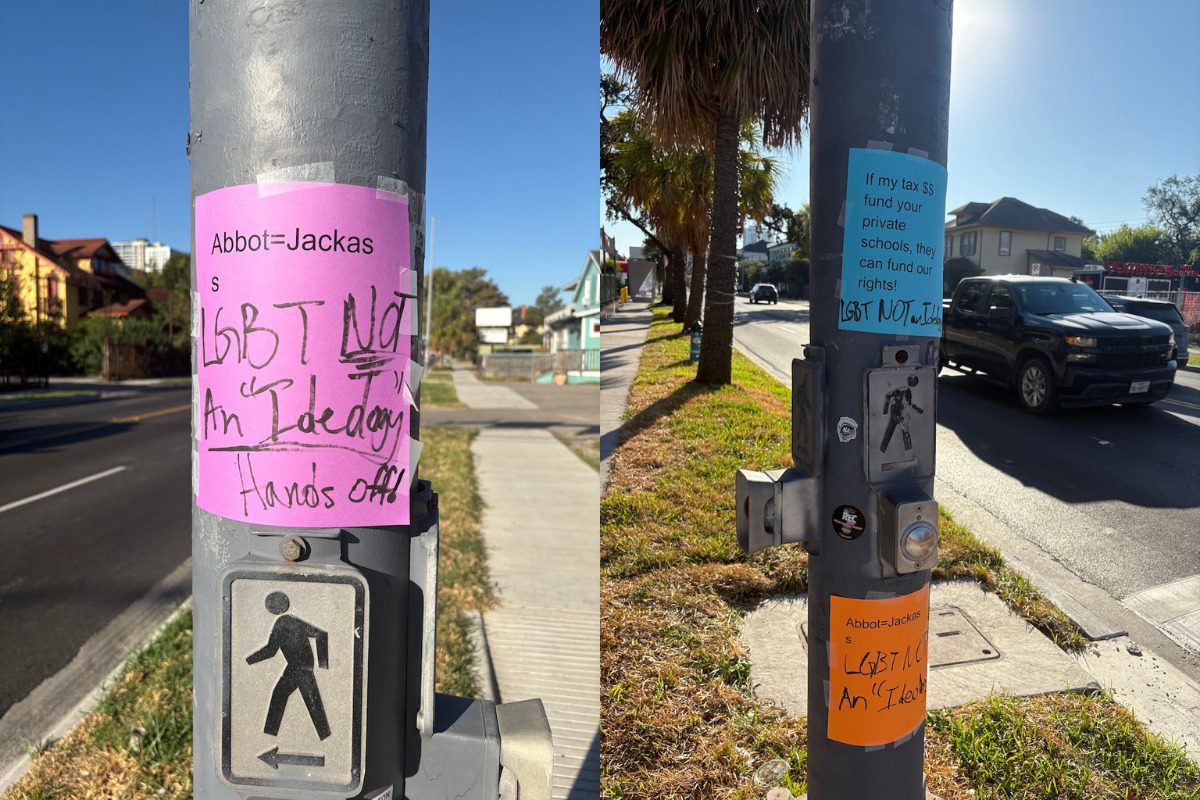 When I visited the crosswalk Friday morning, I noticed a number of signs taped to nearby poles and structures, decrying Abbott’s decision to paint over the rainbow. As some of the signs stated, “LGBT is not an ideology. Hands off!”