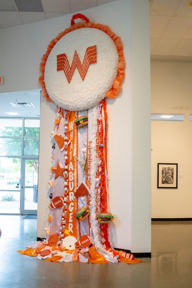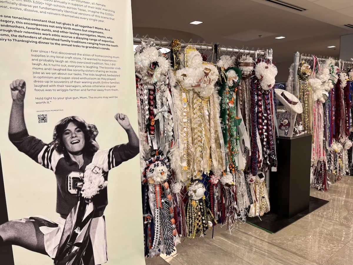 Garland City Hall is currently hosting a mum exhibit called Mumentous: The Upsizing of a Texas Tradition, created by Fort Worth photographer Amy J. Shultz. Shultz became obsessed with mums after making some at a school fundraising event. She grew a portfolio that focused on the tradition, and that caught the eye of the Arlington Museum of Art, who offered her an artist-in-residency. The result—a multimedia gallery all about the heritage of homecoming and the mums role —led to a book and now a traveling exhibit.