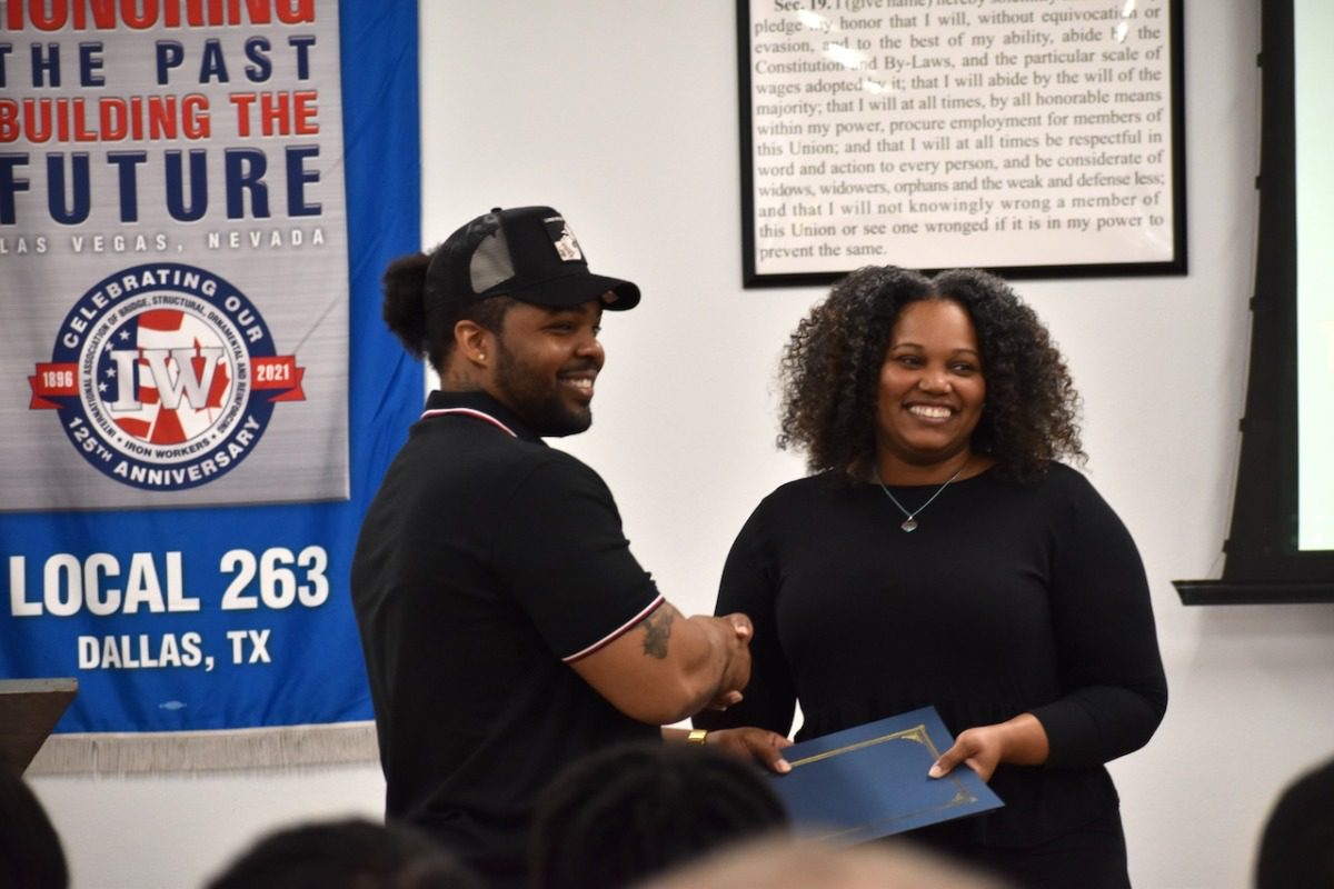 The April 2025 DFW cohort gathered recently in an iron worker union building in Arlington as the Texas Climate Jobs team led the graduation ceremony. Participants heard from trade labor leader Leonard Aguilar and then a commencement speech from Dallas County Judge Clay Jenkins. Graduates also received congratulatory letters from Congresswoman Jasmine Crockett.