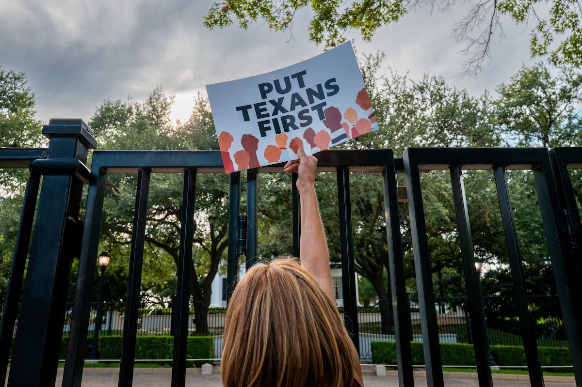 A crowd gathered outside Gov. Greg Abbott’s mansion to protest his redistricting plan on Monday, Aug. 4, 2025. (Brandon Bell/Getty Images)