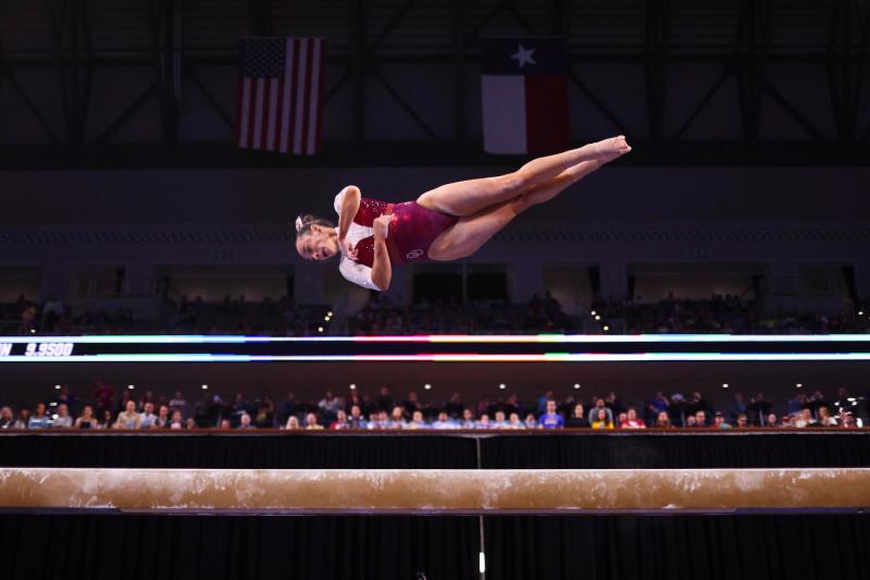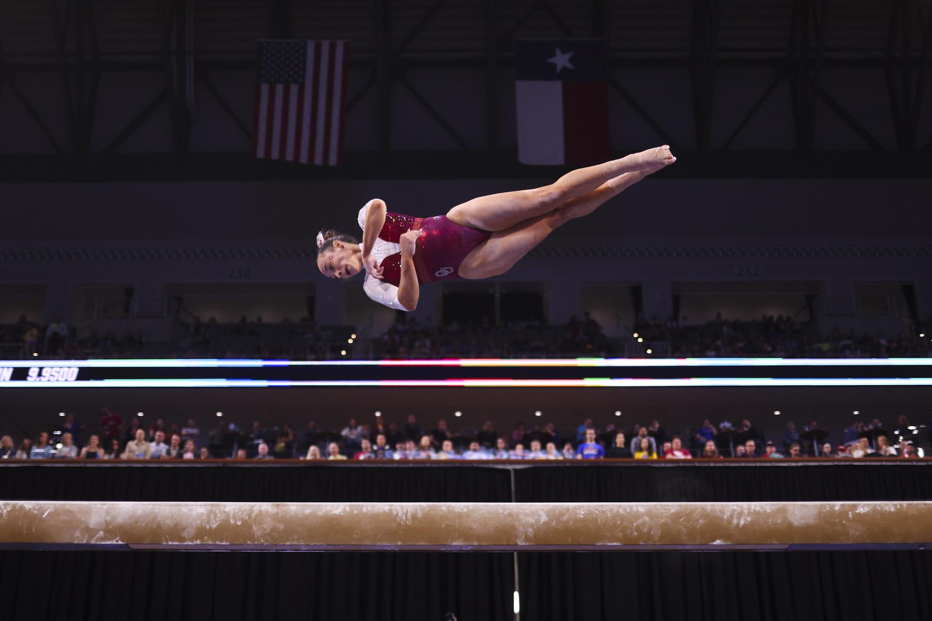 Fort Worth’s Dickies Arena hosted the 2026 NCAA women’s gymnastics finals last week, where LSU, University of Minnesota, University of Florida, and University of Oklahoma battled it out for the title. The OU Sooners took their fourth win in five years Saturday night. Above, Faith Torrez of the Oklahoma Sooners competes on the balance beam. (C. Morgan Engel/NCAA Photos via Getty Images)