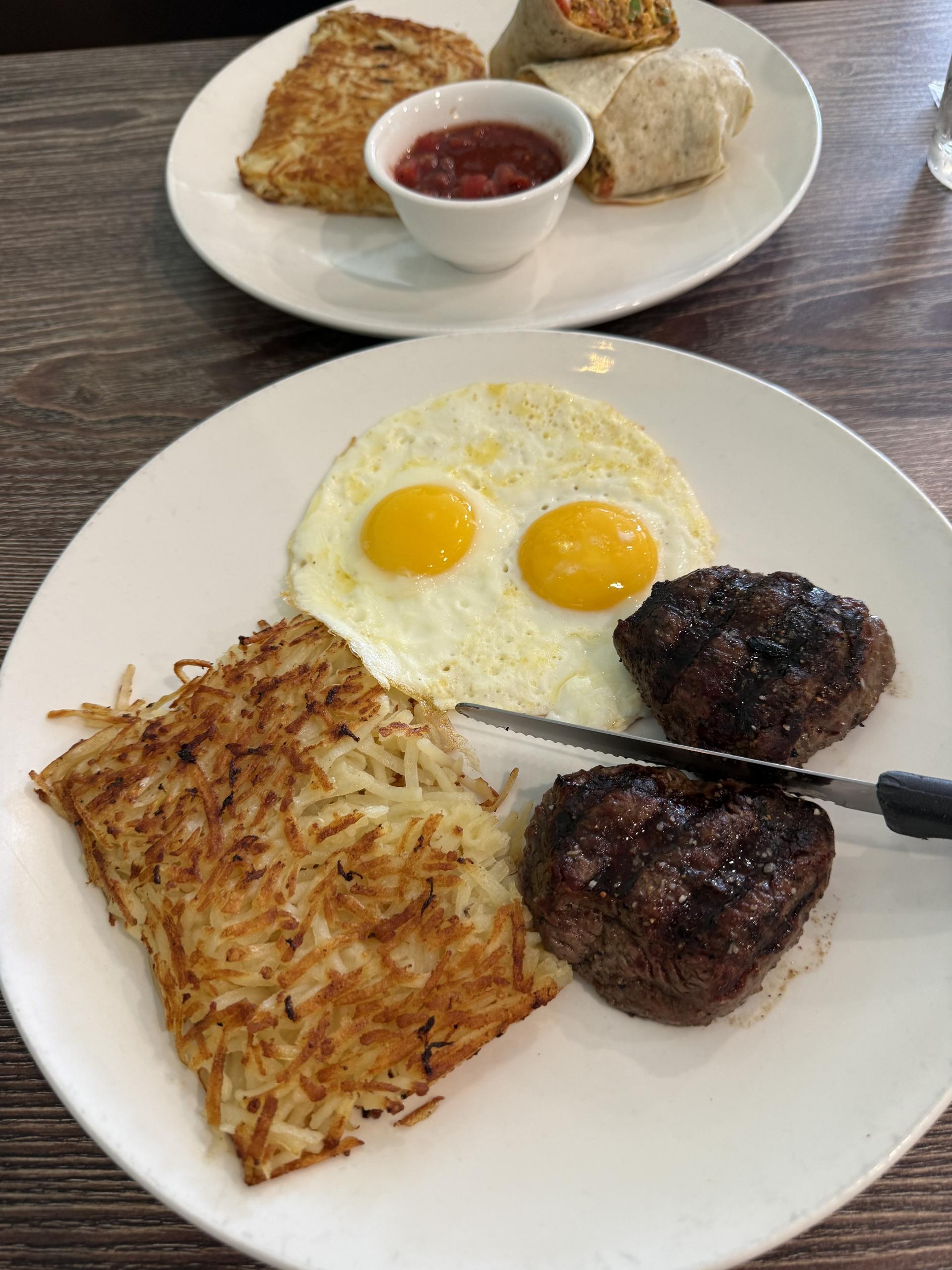 On their menu, you’ll find crepes, French toast, omelettes, and five different kinds of benedicts. They also prepare salads and burgers if you’re dining with someone who isn’t in a breakfast mood. I wanted a heartier option and ordered steak medallions with eggs and hash browns.