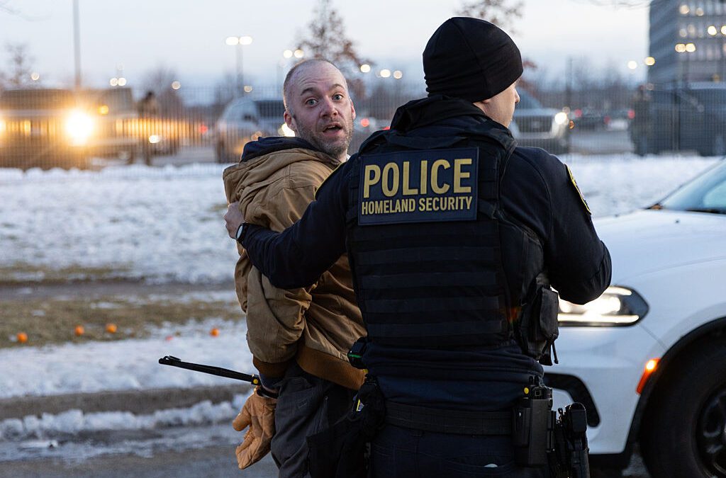 Federal agents arrest a protestor outside an ICE facility after he allegedly attempted to block a vehicle during a protest against ICE in Minneapolis, Minn., on Jan. 9, 2026. (Mostafa Bassim/Anadolu via Getty Images)