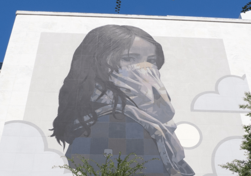 “When Tomorrow Comes” is a mural of a young girl wearing a face scarf due to pollution, painted in Houston. (Teresa Otto/Shutterstock)